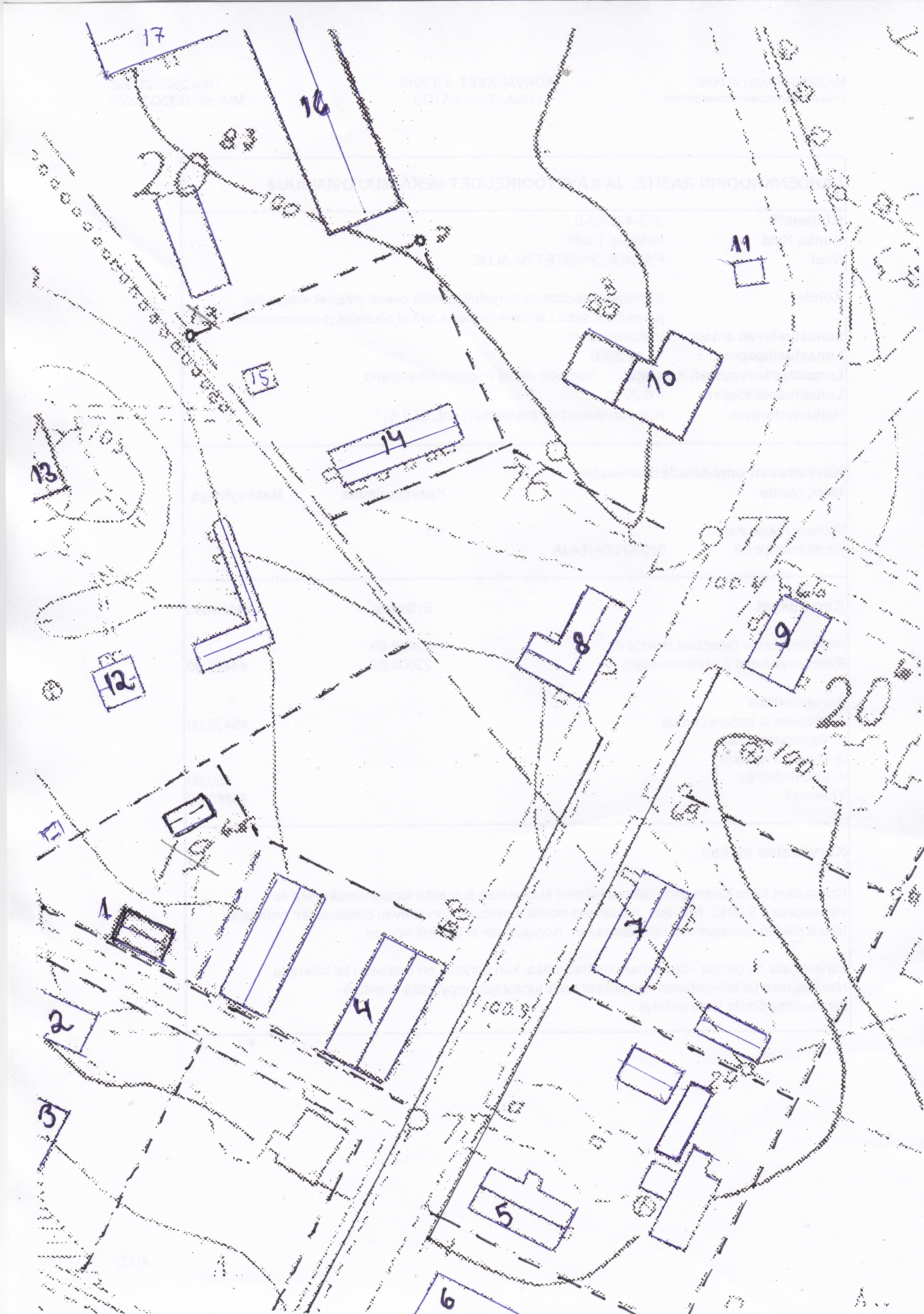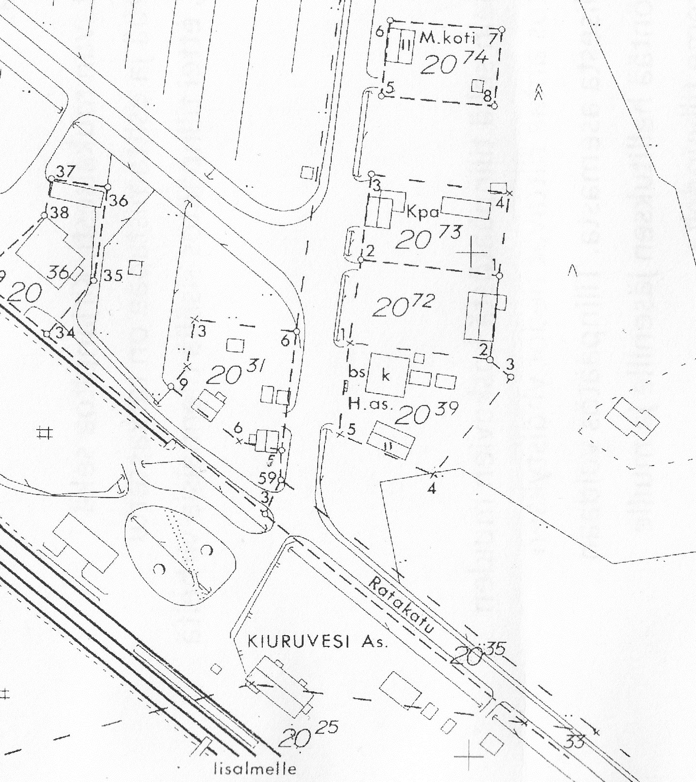 nro 31 Liljan tontti, jolla Otava, asunto ja kiosti, nro 39 huoltoasema (H.as), 72 Elon viljavarasto, 73 Osulan jakamo (Kpa) sekä 74 matkustajakoti Tapiola (M.koti) (Kaupungin arkisto).