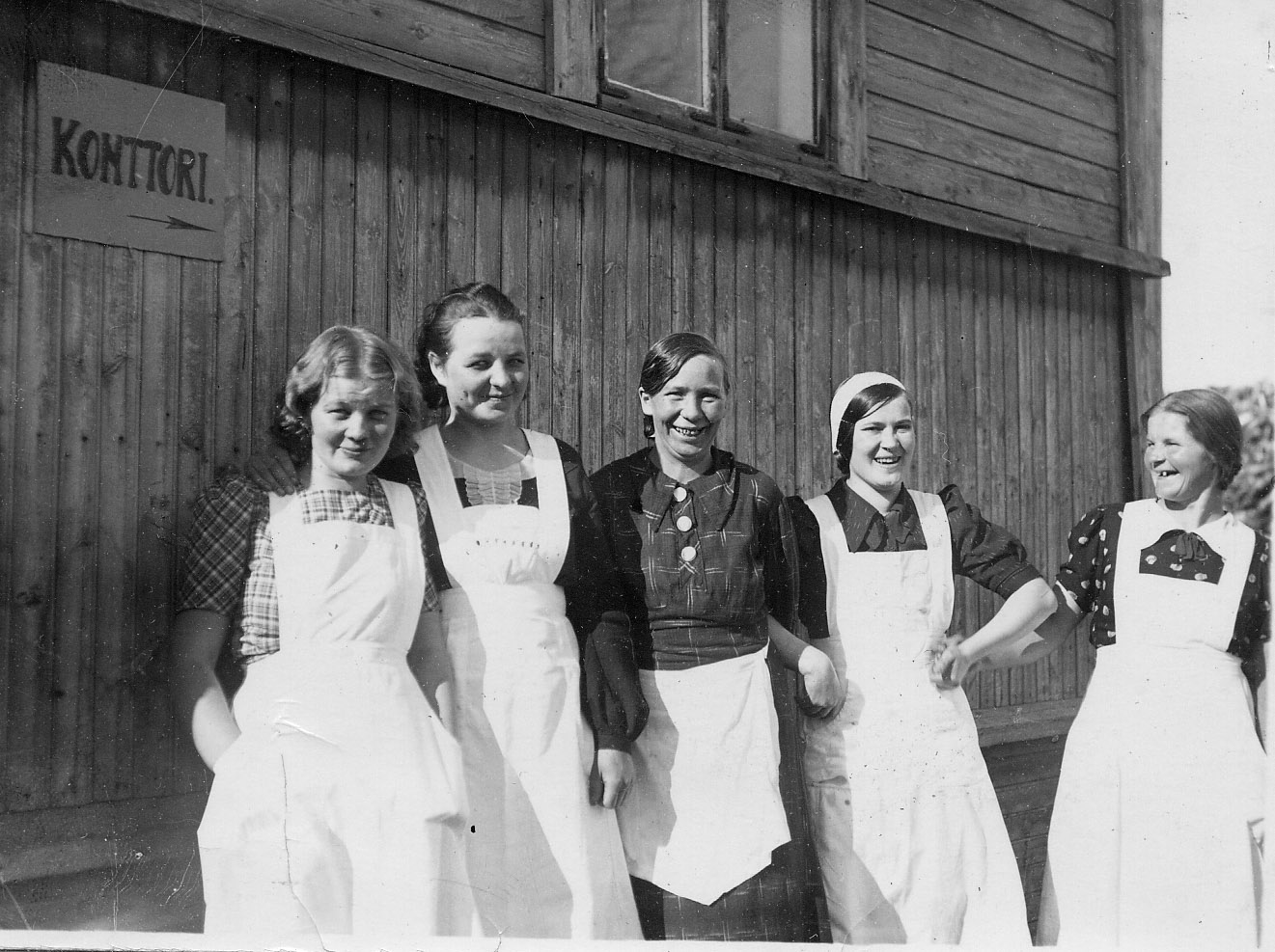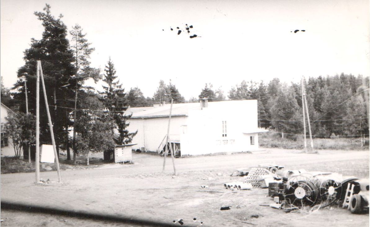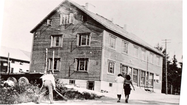 Kuva rakennuksen asunnon puoleisesta päädystä. Asunnossa oli kaksi huonetta ja keittiö sekä kapea komero esityskankaan takana. Rappusilla istuu johtaja Autio (mustat liivit), edessä mummoni ja äitini. Muistelija heidän välissään.