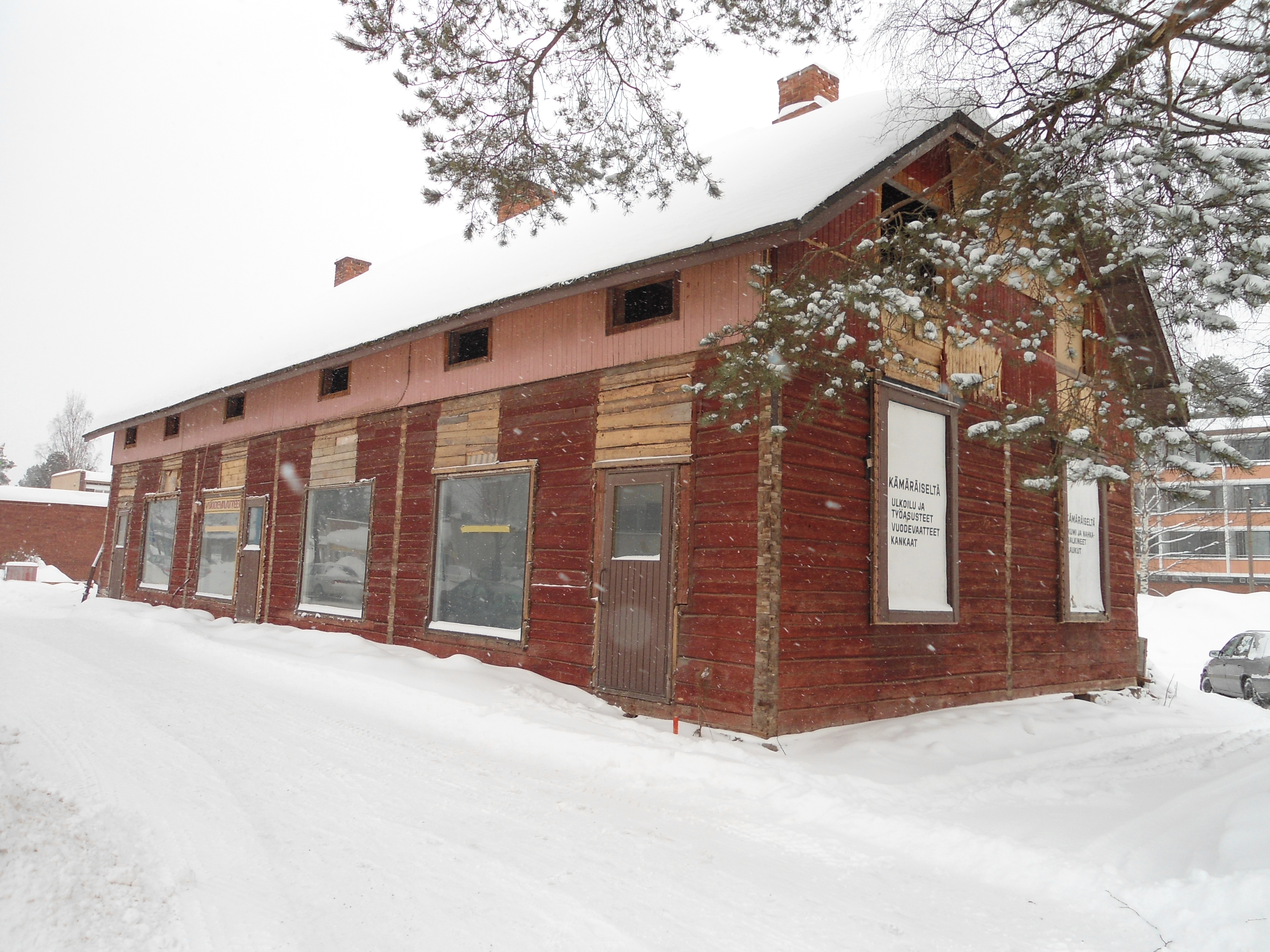 Heti puron toisella puolella, oikealla, komeileva kaksikerroksinen, omaleimaisen näköinen keltainen pytinki, on toiminut nimittäin kerran vanhaan tehtaana. Ellei nyt aivan itse pytinki, mutta sillä kohtaa kuitenkin. Muistitietojen mukaan siinä on alkuaan ollut puusepän verstas. Perustajina Uuno Tapaninen, Timo Kärkkäinen ja Arvo Ruotsalainen. Vuosiluku 1945. Artikkeleina olivat olleet lähinnä ovet ja ikkunat. Työntekijöitä oli lähes kymmenkunta. Toimintavuosia kertyi puolenkymmentä 40-50 –luvun vaihteeseen, jolloin herrat Werta ja Tiainen pistivät rakennukseen pystyyn huopatossutehtaan. Vaikka huopatossutehdas ei toiminut kuin muutaman vuoden viisikymmenluvun alussa, työntekijöitä ehti silti olla parhaana aikana parikymmentäkin. Syyksi lopettamiseen muistellaan onnettomuudeksi sattuneet leidot talvet. – Ei tarvittu huopatossuja.