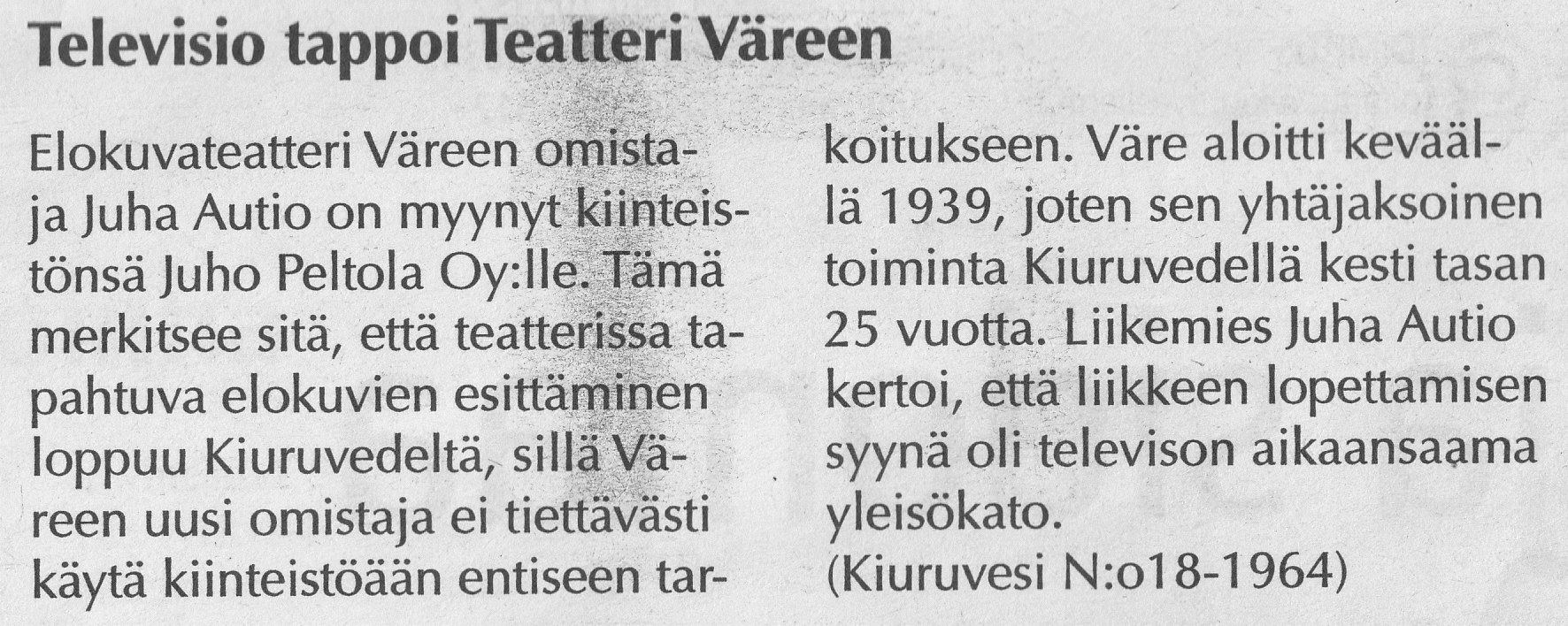 Elokuvateatteri Wäre / Raimo Kallio ja Kiuruvesi-lehti 30.4.2014