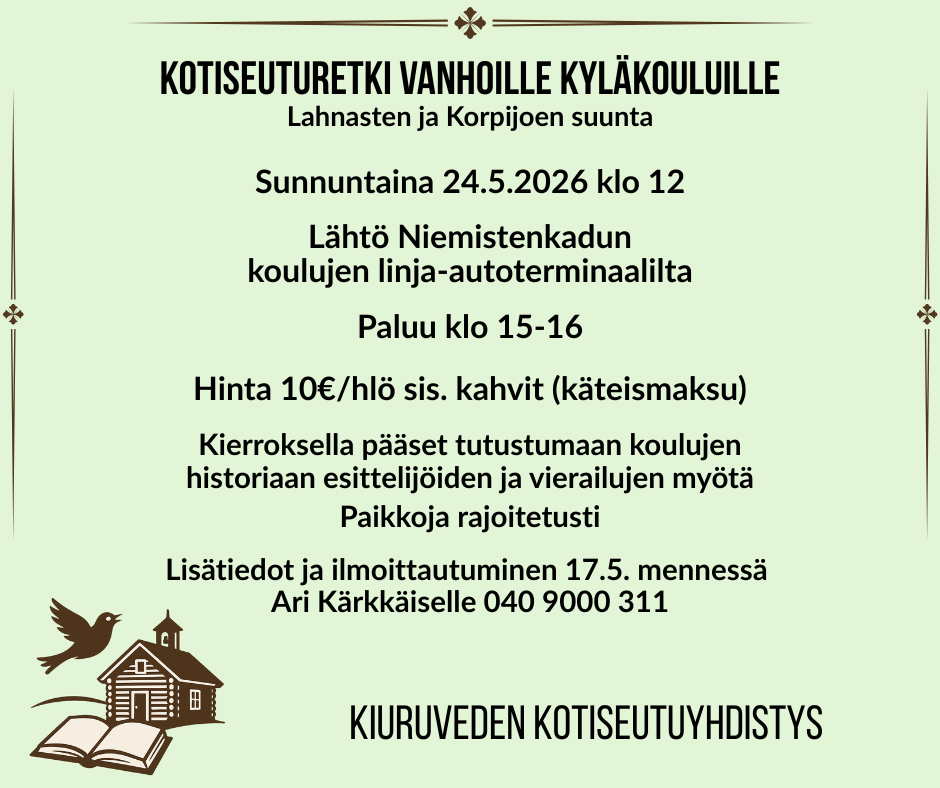 Sitä odotellessa, tervetuloa Kiuruveden kotiseutuyhdistyksen järjestämälle kyläkoulukierrokselle joka tällä kertaa suuntautuu Lahnasten ja Korpijoen suuntaan!